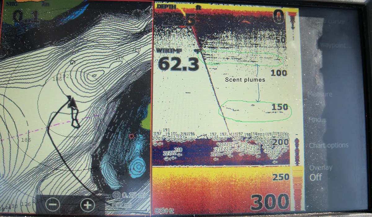 Looking at the picture closely, you can see scent trails on the down-current side of the lure’s decent line but no returns bouncing off anything up-current of the decent line. Pretty cool!